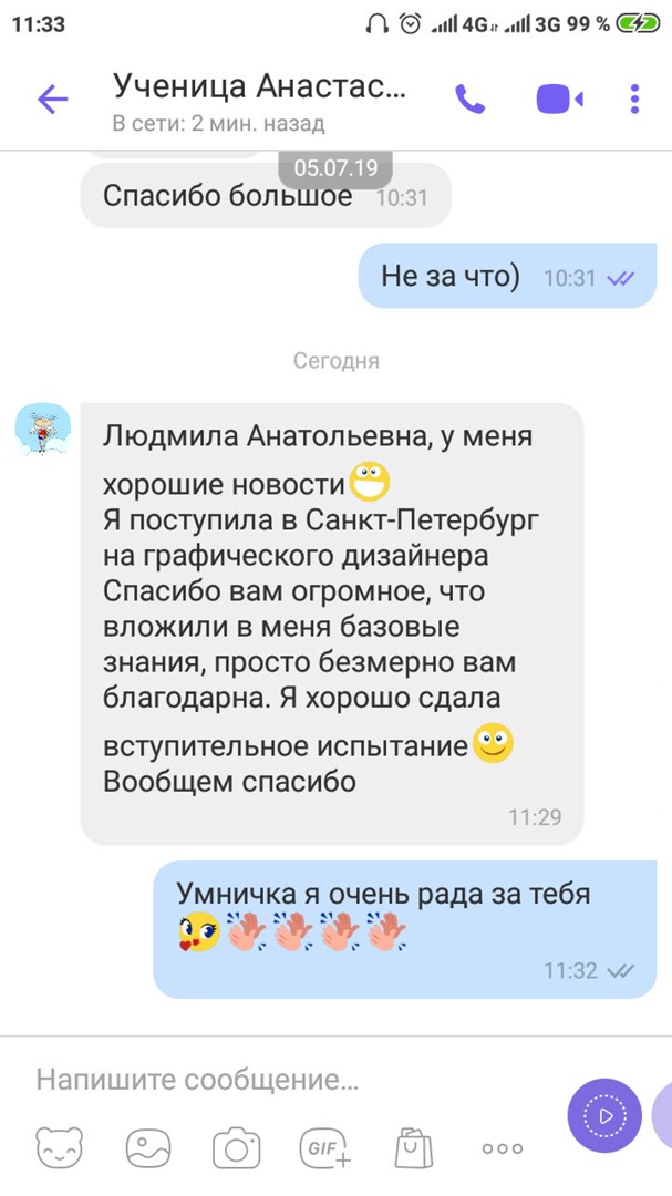 • Людмила Анатольевна! У меня хорошие новости! Я поступила в Санкт-Петербург на графического дизайнера. Спасибо Вам огромное, что вложили в меня базовые знания, просто безмерно Вам благодарна. Я хорошо сдала вступительное испытание. Вообщем спасибо.