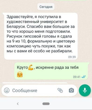 • Здравствуйте. Я поступила в художественный университет в Белоруссии. Спасибо Вам за то, что хорошо меня подготовили. Рисунок гипсовой головы, я сдала 9 из 10. ФОрмальную и цветовую композицию чуть по хуже. Так как мы с Вами ее не особо разбирали.